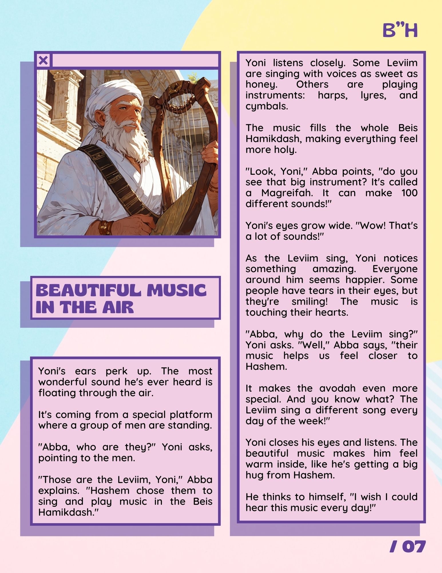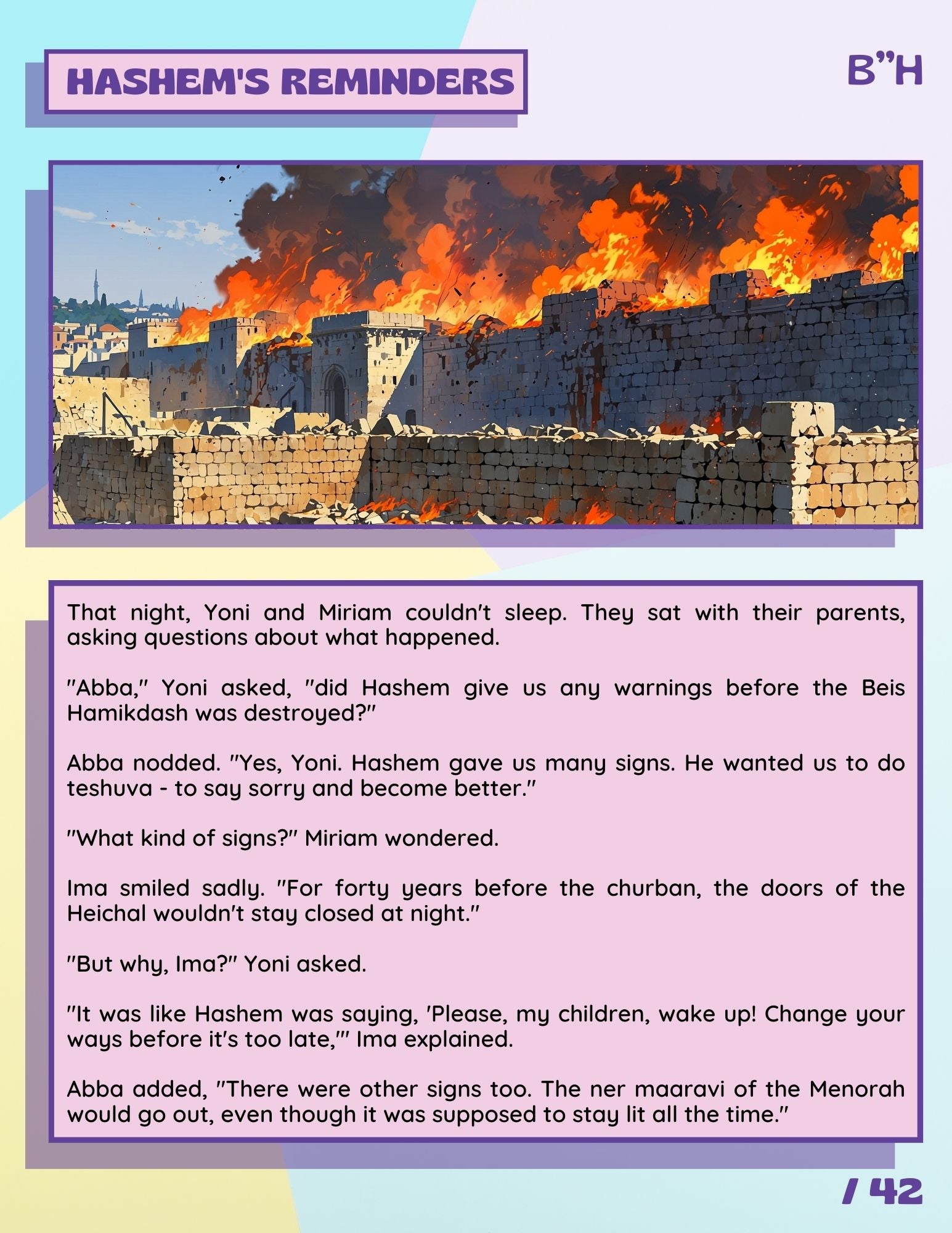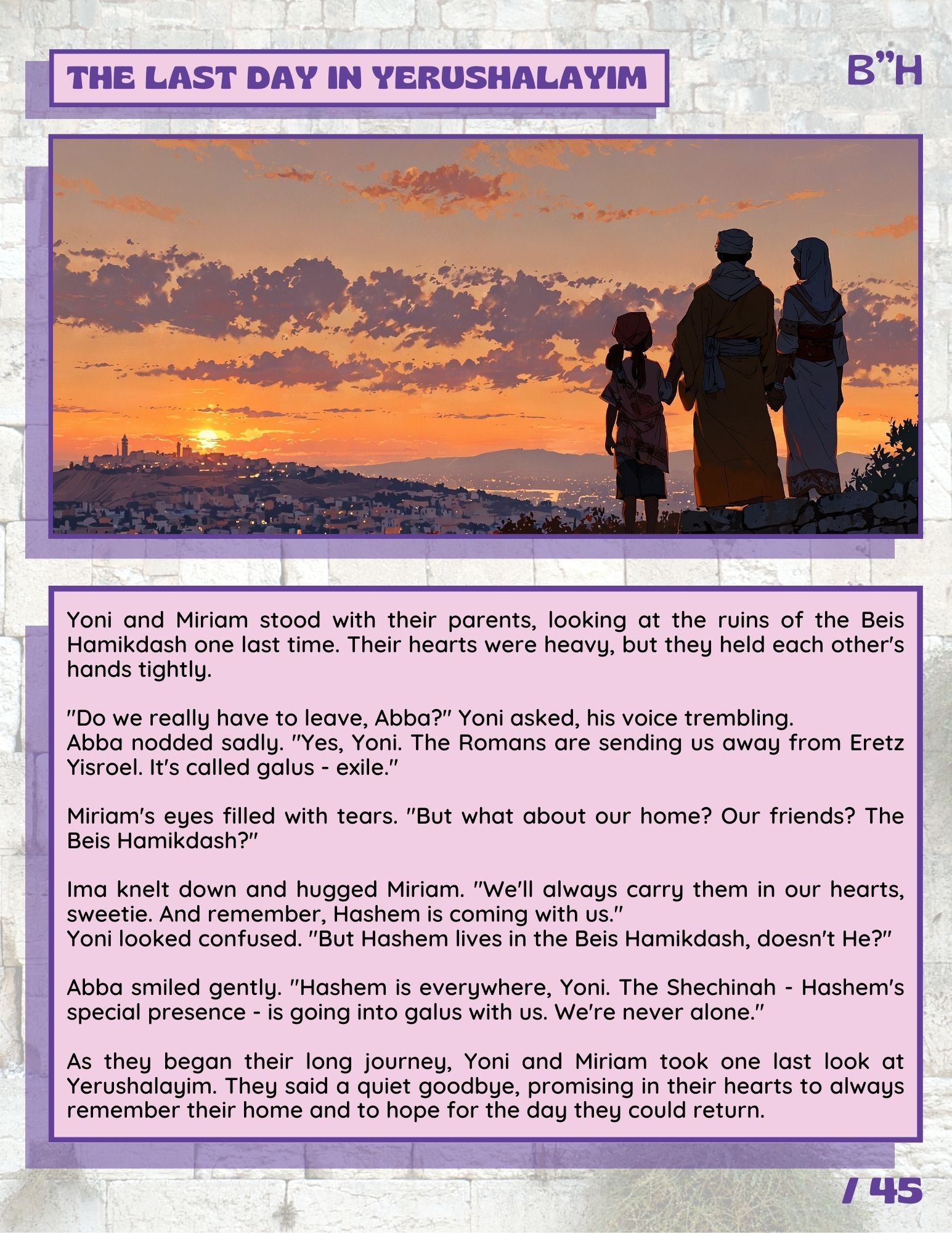 Experience the beauty and tragedy of the Second Beis Hamikdash era through the eyes of children in this beautifully illustrated journey. Follow Yoni and Miriam as they explore Yerushalayim during its glory days and witness its heartbreaking destruction, bringing to life the true significance of the Three Weeks and Tisha B'Av period.